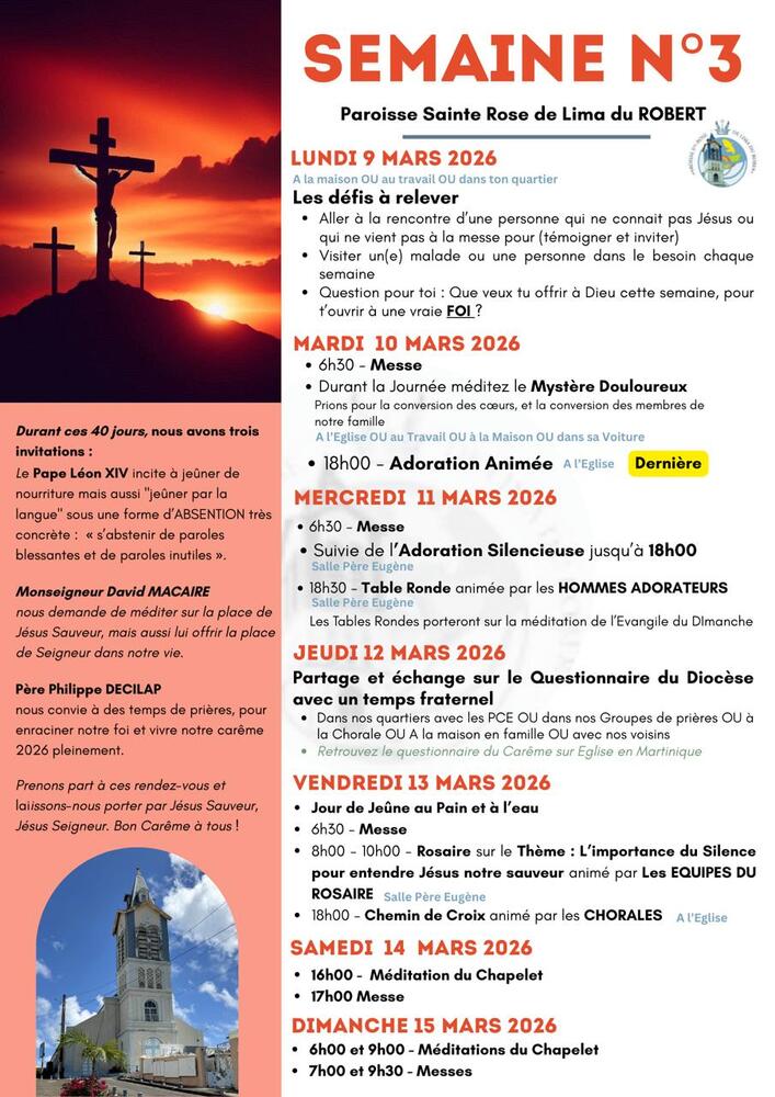 La Paroisse Saint Michel du François propose un programme spirituel riche pour accompagner les fidèles tout au long du Carême 2026. Des temps [...]