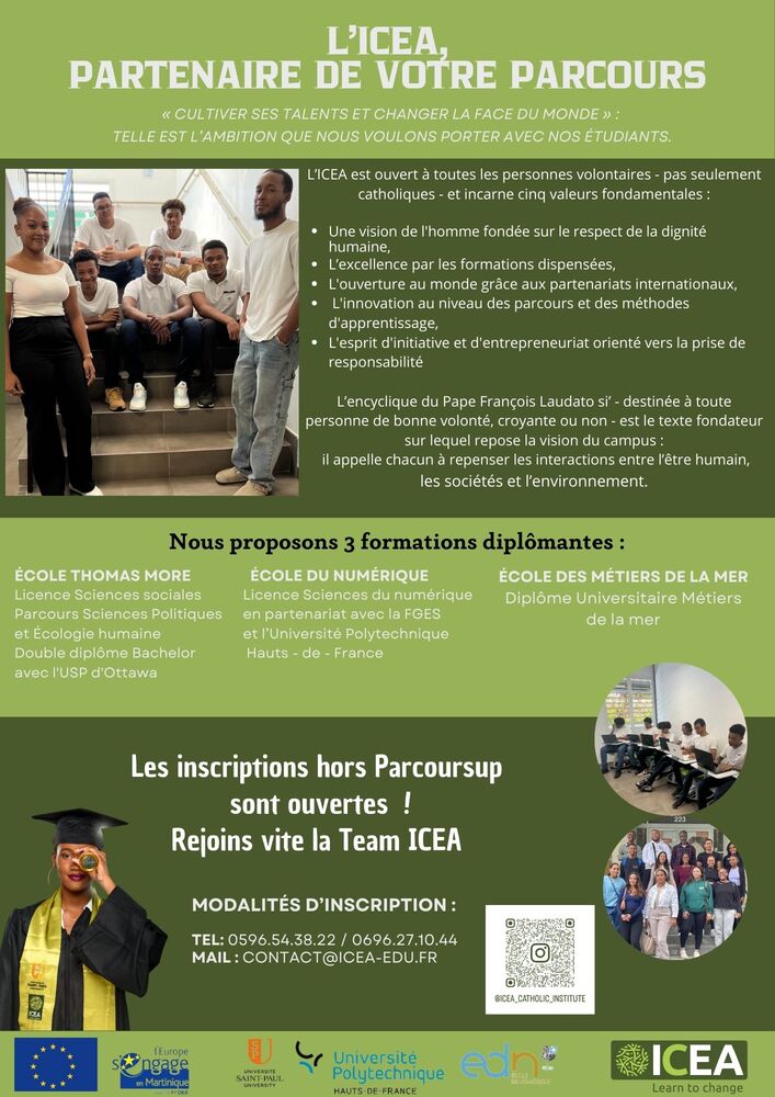 Créé avec des représentants de l'Archevêque et de la société civile, notamment du monde de l'entreprise, l'Institut Catholique Européen des Amériques (ICEA) est présidé par Monseigneur Macaire, Archevêque de Martinique, et dirigé par Alain Arnauld. Seul territoire au monde, avec la Guyane et la Guadeloupe, à être à la fois pleinement européen et situé au milieu du continent américain, la Martinique offre un potentiel unique pour ses étudiants, locaux et internationaux. L’ICEA a pour ambition de mettre en valeur ce potentiel en proposant une offre de formations initiales et continues d’excellence.