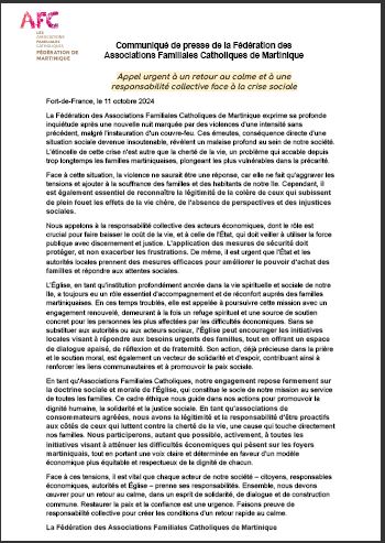 Communiqué de presse de la Fédération des Associations Familiales Catholiques de Martinique Appel urgent à un retour au calme et à une [...]