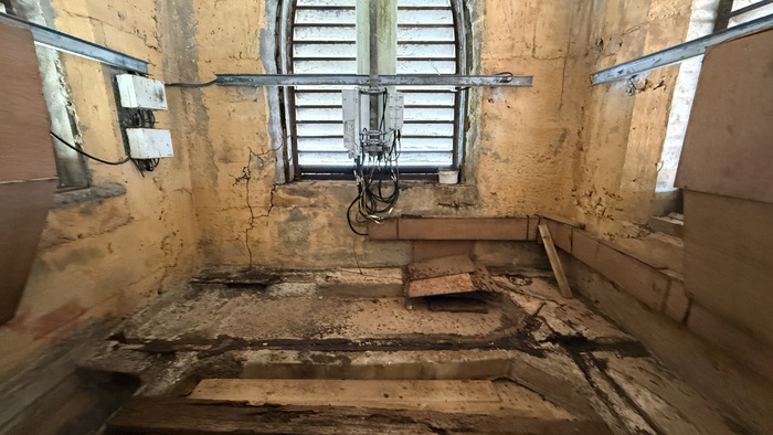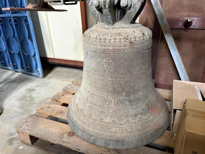 - Refection du beffroi ( cadre qui tient les cloches) construit initialement en acier pour du bois rouge local qui empêchera les vibrations de générer des fissures dans le béton
