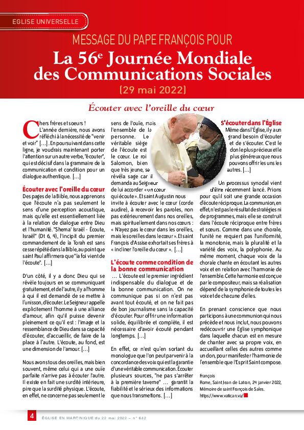 - ÉGLISE UNIVERSELLE - Message du pape François - 56éme Journée de la communication sociale-