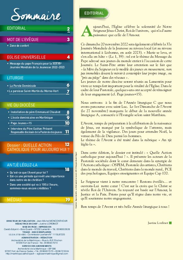 I.S.S.N. 0759-4895 – Commission paritaire N° 1115L87225 ADMINISTRATION – RÉDACTION Archevêché de la Martinique – Rue du R.P. Pinchon 97200 Fort de France - Tél. 05 96 63 70 70