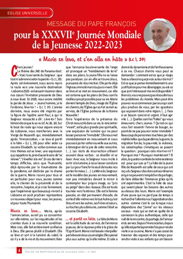 Ce dimanche 20 novembre 2022 sera également célébrée la 37e Journée Mondiale de la Jeunesse au niveau local (et au niveau international à Lisbonne, en août 2023). « Marie se leva, et s’en alla en hâte » (Lc 1, 39) : tel est le thème du Message du Pape adressé aux jeunes du monde entier à l’occasion de cette Journée. Le Saint-Père attire leur attention sur le fait que « la Mère du Seigneur est le modèle des jeunes en mouvement, non pas immobiles devant le miroir à contempler leur propre image, ou "pris au piège" dans des réseaux ». Les jeunes de notre diocèse seront réunis au Lamentin pour
