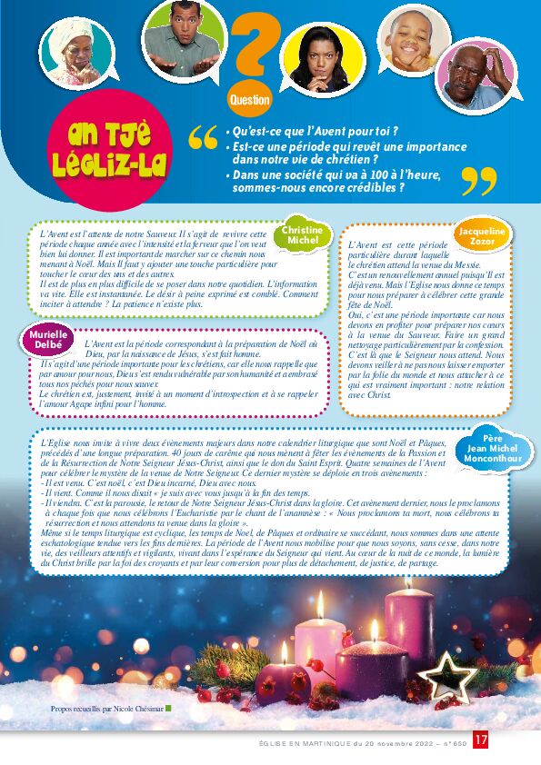 Le thème de l’Avent a été traité dans la rubrique « An tjè légliz-la ». Dans cette édition, le dossier est intitulé : « Quelle Action catholique pour aujourd’hui ? ». Il présente les acteurs de la Pastorale sociétale dont le cœur demeure dans la synergie de