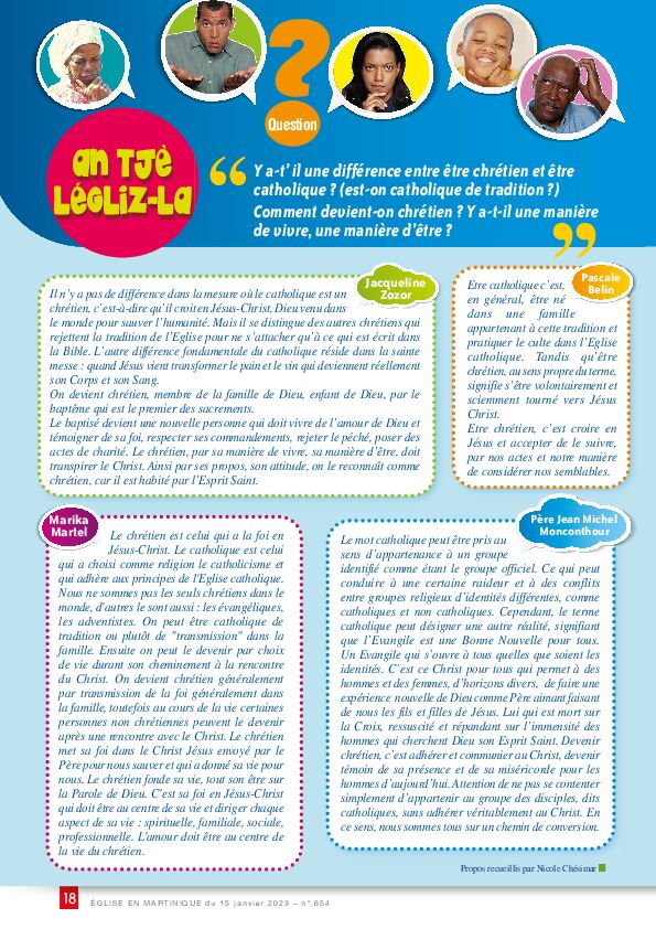 - ANTJÈ LÉGLIZ-LA - "Y a-t’ il une différence entre être chrétien et être catholique ? (est-on catholique de tradition ?) Comment devient-on chrétien ? Y a-t-il une manière de vivre, une manière d’être ? "