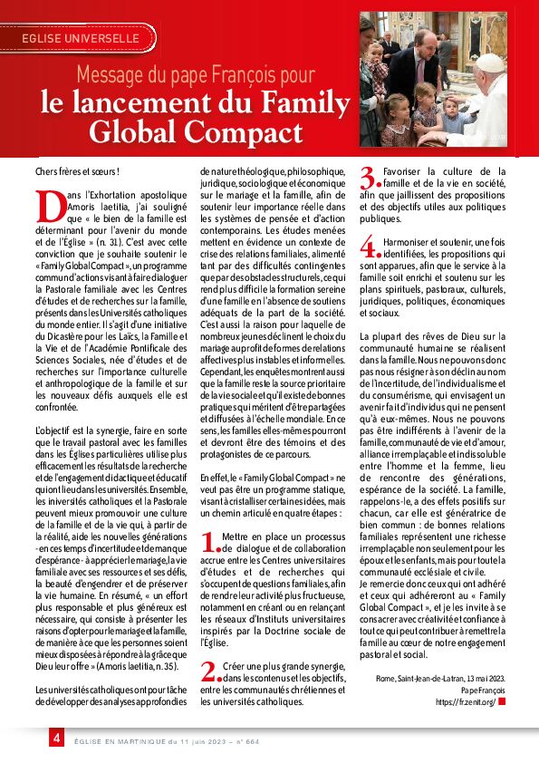 - EGLISE UNIVERSELLE - Message du pape François pour le lancement du Family Global Compact