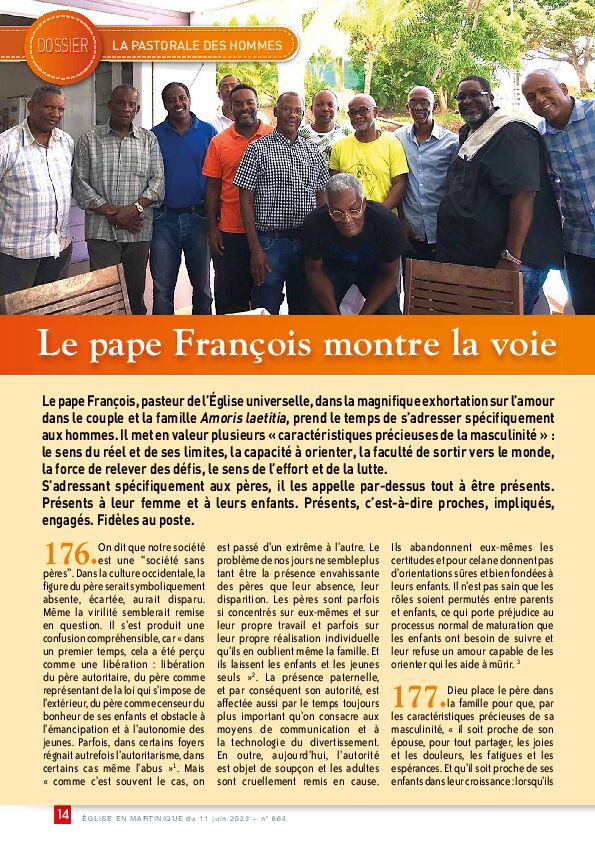 Dimanche prochain (18 juin), ce sera la fête des pères. A cette occasion, Eglise en Martinique a consacré son dossier à la Pastorale des hommes. Le pape François invite ces derniers à être présents, proches, impliqués et engagés dans la cellule familiale.