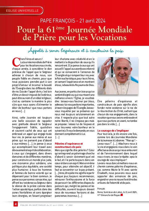- ÉGLISE UNIVERSELLE - Pape François - Message du pape François pour la 61ème Journée Mondiale de Prière pour les Vocations