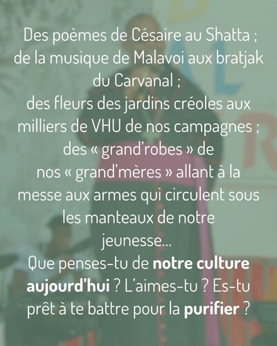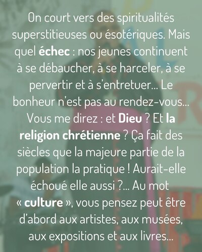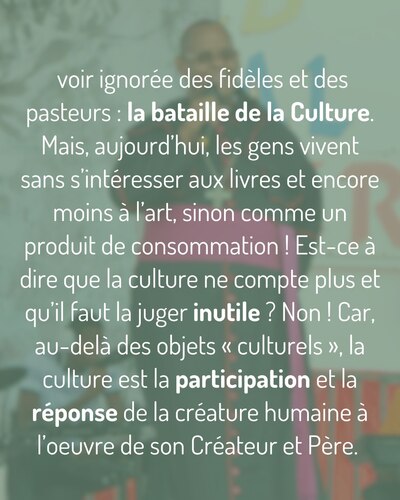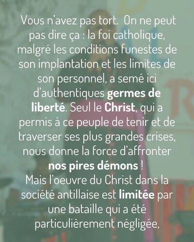 Vous me direz : et Dieu ? Et la religion chrétienne ? Ça fait des siècles que la majeure partie de la population la pratique ! Aurait-elle échoué elle aussi ?... On ne peut pas dire ça : la foi catholique, malgré les conditions funestes de son implantation et les limites de son personnel, a semé ici d’authentiques germes de liberté. Seul le Christ, qui a permis à ce peuple de tenir et de traverser ses plus grandes crises, nous donne la force d’affronter nos pires démons ! Mais l’oeuvre du Christ dans la société antillaise est limitée par une bataille qui a été particulièrement négligée, voir ignorée des fidèles et des pasteurs : la bataille de la Culture.