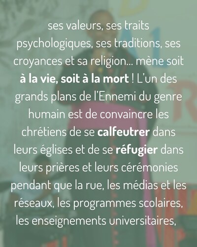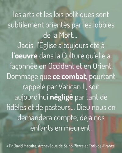 L’un des grands plans de l’Ennemi du genre humain est de convaincre les chrétiens de se calfeutrer dans leurs églises et de se réfugier dans leurs prières et leurs cérémonies pendant que la rue, les médias et les réseaux, les programmes scolaires, les enseignements universitaires, les arts et les lois politiques sont subtilement orientés par les lobbies de la Mort… Jadis, l’Église a toujours été à l’oeuvre dans la Culture qu’elle a façonnée en Occident et en Orient. Dommage que ce combat, pourtant rappelé par Vatican II, soit aujourd’hui négligé par tant de fidèles et de pasteurs… Dieu nous en demandera compte, déjà nos enfants en meurent.