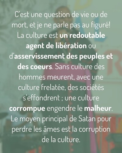 C’est une question de vie ou de mort, et je ne parle pas au figuré ! La culture est un redoutable agent de libération ou d’asservissement des peuples et des coeurs. Sans culture des hommes meurent, avec une culture frelatée, des sociétés s’effondrent ; une culture corrompue engendre le malheur. Le moyen principal de Satan pour perdre les âmes est la corruption de la culture. Inversement, Dieu lui-même s’est toujours penché sur la culture de chaque peuple pour conduire l’humanité au salut et au bonheur !