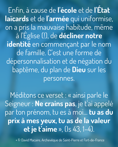 Appeler quelqu'un par son prénom c'est avoir avec lui un certain lien d'intimité car c'est comme détenir le secret de son identité et de son chemin (d'ailleurs chez nous, comme on l'entend encore aux avis d'obsèques, les anciens, bien souvent, avaient un prénom caché sous un surnom ou un p'tit-nom public). Malheureusement, beaucoup de fidèles ne se sont jamais interrogés sur le sens de leur prénom. D'abord sur la raison pour laquelle leurs parents les ont ainsi nommés, mais aussi et surtout sur le sens et l'origine du mot même par lequel on les appelle et les désigne tous les jours. En découle la dangereuse coutume locale de donner aux enfants des prénoms qui sont des nullédictions, des prénoms qui ne veulent rien dire. Juste des syllabes juxtaposées pour faire un son original. Mais il n'y a pas de nullédictions ! Dire à quelqu'un « ton prénom ne veut rien dire » ou « ton prénom veut dire n'importe quoi » peut être une forme de non-amour... une forme de mépris par omission ! Sans parler des prénoms qui sont d'authentiques malédictions, des prénoms de démons, de personnages maléfiques, voire de machines… que les parents donnent (Dieu merci) sans le savoir ! Enfin, à cause de l'école et de l'État laïcards et de l'armée qui uniformise, on a pris la mauvaise habitude, même à l'Église (!), de décliner notre identité en commençant par le nom de famille. C'est une forme de dépersonnalisation et de négation du baptême, du plan de Dieu sur les personnes.
