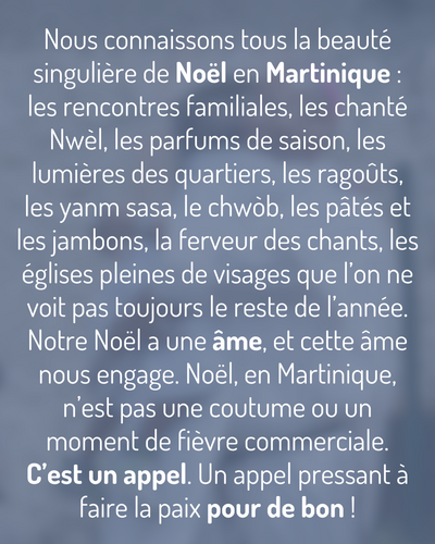 Nous connaissons tous la beauté singulière de Noël en Martinique : les rencontres familiales, les chanté Nwèl, les parfums de saison, les lumières des quartiers, les ragoûts, les yanm sasa, le chwòb, les pâtés et les jambons, la ferveur des chants, les églises pleines de visages que l’on ne voit pas toujours le reste de l’année. Notre Noël a une âme, et cette âme nous engage. Noël, en Martinique, n’est pas une coutume ou un moment de fièvre commerciale. C’est un appel. Un appel pressant à faire la paix pour de bon !