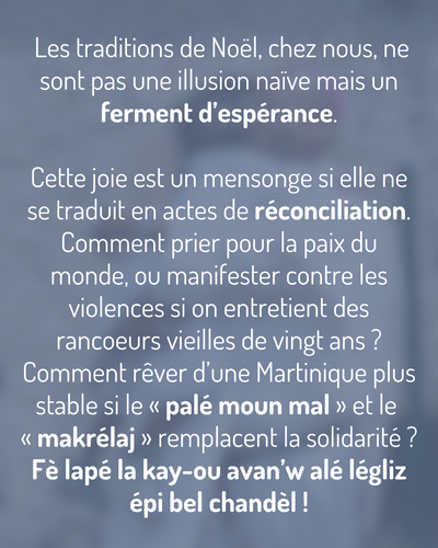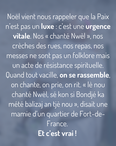 Noël vient nous rappeler que la Paix n’est pas un luxe : c’est une urgence vitale. Nos « chanté Nwèl », nos crèches des rues, nos repas, nos messes ne sont pas un folklore mais un acte de résistance spirituelle. Quand tout vacille, on se rassemble, on chante, on prie, on rit. « lè nou chanté Nwèl, sé kon si Bondjé ka mété balizaj an tjè nou », disait une mamie d’un quartier de Fort-de-France. Et c’est vrai ! Les traditions de Noël, chez nous, ne sont pas une illusion naïve mais un ferment d’espérance.