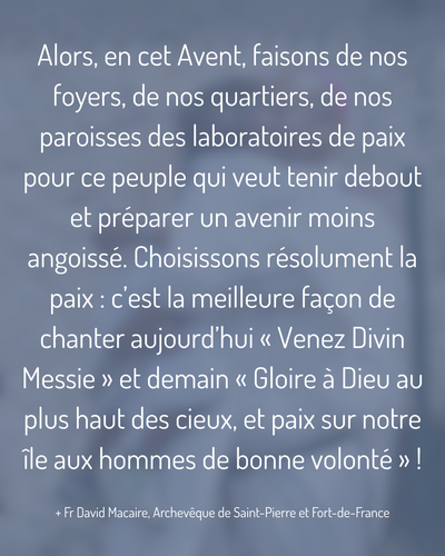 Alors, en cet Avent, faisons de nos foyers, de nos quartiers, de nos paroisses des laboratoires de paix pour ce peuple qui veut tenir debout et préparer un avenir moins angoissé. Choisissons résolument la paix : c’est la meilleure façon de chanter aujourd’hui « Venez Divin Messie » et demain « Gloire à Dieu au plus haut des cieux, et paix sur notre île aux hommes de bonne volonté » !