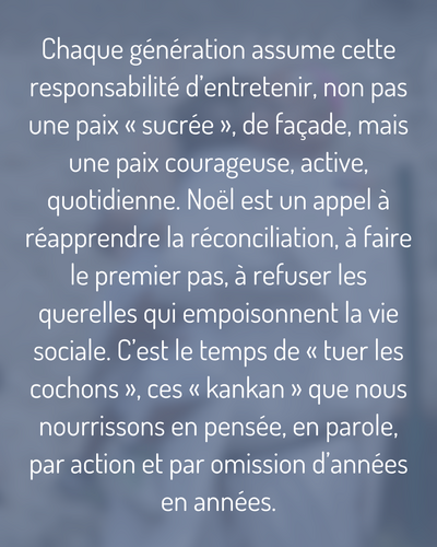 Chaque génération assume cette responsabilité d’entretenir, non pas une paix « sucrée », de façade, mais une paix courageuse, active, quotidienne. Noël est un appel à réapprendre la réconciliation, à faire le premier pas, à refuser les querelles qui empoisonnent la vie sociale. C’est le temps de « tuer les cochons », ces « kankan » que nous nourrissons en pensée, en parole, par action et par omission d’années en années.