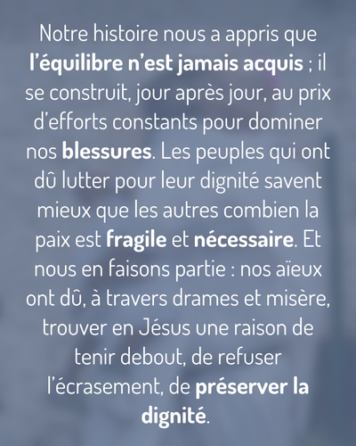 Notre histoire nous a appris que l’équilibre n’est jamais acquis ; il se construit, jour après jour, au prix d’efforts constants pour dominer nos blessures. Les peuples qui ont dû lutter pour leur dignité savent mieux que les autres combien la paix est fragile et nécessaire. Et nous en faisons partie : nos aïeux ont dû, à travers drames et misère, trouver en Jésus une raison de tenir debout, de refuser l’écrasement, de préserver la dignité. Ils ont appris – parfois dans les larmes – qu’aucun peuple ne survit sans répondre à l’appel divin par des gestes concrets, même petits, même fragiles. À Noël, justement, Dieu se fait petit pour nous rappeler que la Paix commence petit : un pardon donné, une visite, un cadeau, un texto à quelqu’un d’oublié, une dispute qu’on laisse tomber, un geste pour un voisin en difficulté.