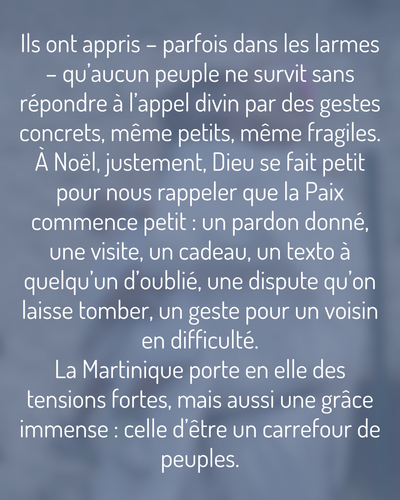 La Martinique porte en elle des tensions fortes, mais aussi une grâce immense : celle d’être un carrefour de peuples. Ici, on a appris – tant bien que mal – le vivre ensemble. Cette terre blessée a une vocation : montrer comment la Paix peut éclore même là où l’histoire fut violente. Noël, en Martinique, doit être ce temps où un peuple tout entier renonce aux ténèbres pour marcher dans la lumière du Christ.