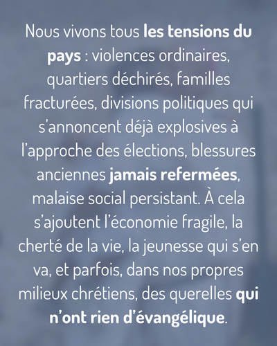 Nous vivons tous les tensions du pays : violences ordinaires, quartiers déchirés, familles fracturées, divisions politiques qui s’annoncent déjà explosives à l’approche des élections, blessures anciennes jamais refermées, malaise social persistant. À cela s’ajoutent l’économie fragile, la cherté de la vie, la jeunesse qui s’en va, et parfois, dans nos propres milieux chrétiens, des querelles qui n’ont rien d’évangélique.