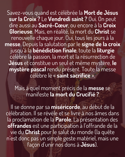 Savez-vous quand est célébrée la Mort de Jésus sur la Croix ? Le Vendredi saint ? Oui. On peut dire aussi au Sacré-Coeur, ou encore à la Croix Glorieuse. Mais, en réalité, la mort du Christ se renouvelle chaque jour. Oui, tous les jours à la messe. Depuis la salutation par le signe de la croix jusqu’à la bénédiction finale, toute la liturgie célèbre la passion, la mort et la résurrection de Jésus et constitue un seul et même mystère, le mystère pascal rendu présent. Toute la messe célèbre le « saint sacrifice ».