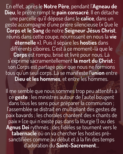 En effet, après le Notre Père, pendant l’Agneau de Dieu, le prêtre rompt le pain consacré. Il en détache une parcelle qu’il dépose dans le calice, dans un geste accompagné d’une prière silencieuse (« Que le Corps et le Sang de notre Seigneur Jésus Christ, réunis dans cette coupe, nourrissent en nous la vie éternelle »). Puis il sépare les hosties dans différents ciboires. C’est à ce moment-là que le Corps est rompu, brisé et livré pour nous. Là s’exprime sacramentellement la mort du Christ : son Corps est partagé pour que nous ne formions tous qu’un seul corps. Là se manifeste l’union entre Dieu et les hommes, et entre les hommes. Il me semble que nous sommes trop peu attentifs à ce geste : les ministres autour de l’autel bougent dans tous les sens pour préparer la communion ; l’assemblée se distrait en multipliant des gestes de paix bavards ; les chorales chantent des « chants de paix » (ce qui n’existe pas dans la liturgie !) ou des Agnus Dei rythmés ; des fidèles se tournent vers le tabernacle où on va chercher les hosties pré-sanctifiées comme au début et à la fin des temps d’adoration du Saint-Sacrement…
