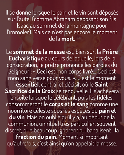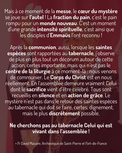 Mais à ce moment de la messe, le coeur du mystère se joue sur l’autel ! La fraction du pain, c’est le pain rompu pour un monde nouveau. C’est un moment d’une grande intensité spirituelle, c’est ainsi que les disciples d’Emmaüs l’ont reconnu !