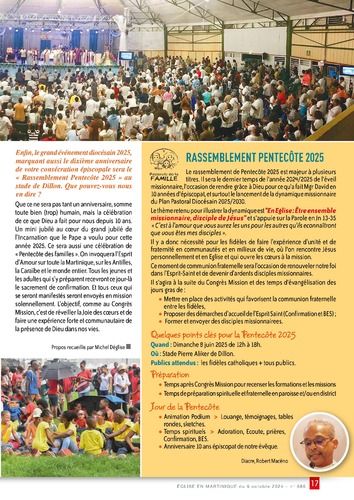 Que ce ne sera pas tant un anniversaire, somme toute bien (trop) humain, mais la célébration de ce que Dieu a fait pour nous depuis 10 ans. Un mini jubilé au coeur du grand jubilé de l’Incarnation que le Pape a voulu pour cette année 2025. Ce sera aussi une célébration de « Pentecôte des familles ». On invoquera l’Esprit d’Amour sur toute la Martinique, sur les Antilles, la Caraïbe et le monde entier. Tous les jeunes et les adultes qui s’y préparent recevront ce jour-là le sacrement de confirmation. Et tous ceux qui se seront manifestés seront envoyés en mission solennellement. L’objectif, comme au Congrès Mission, c’est de réveiller la Joie des coeurs et de faire une expérience forte et communautaire de la présence de Dieu dans nos vies.