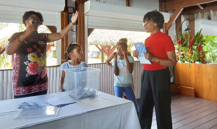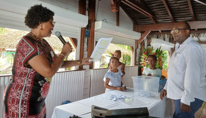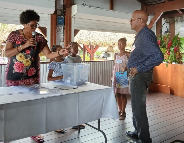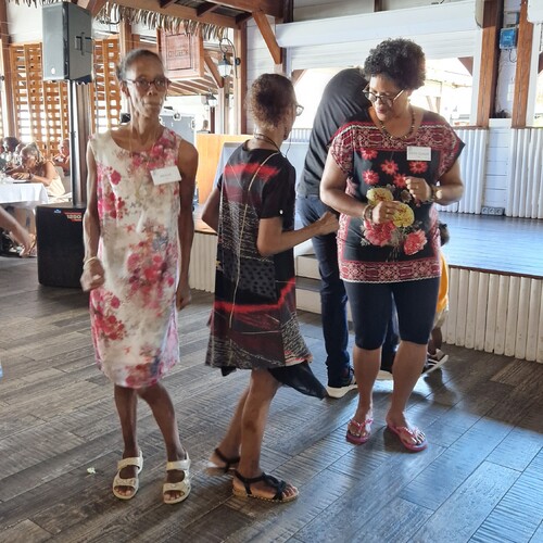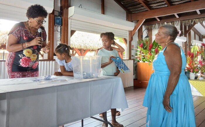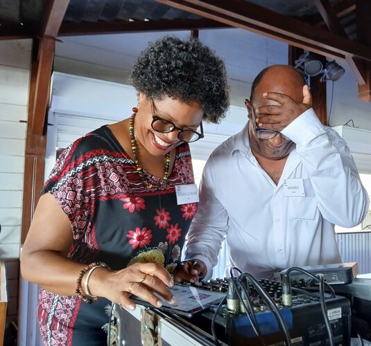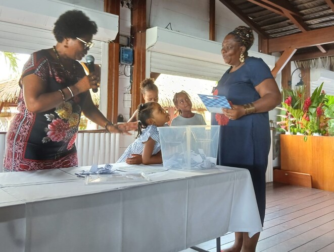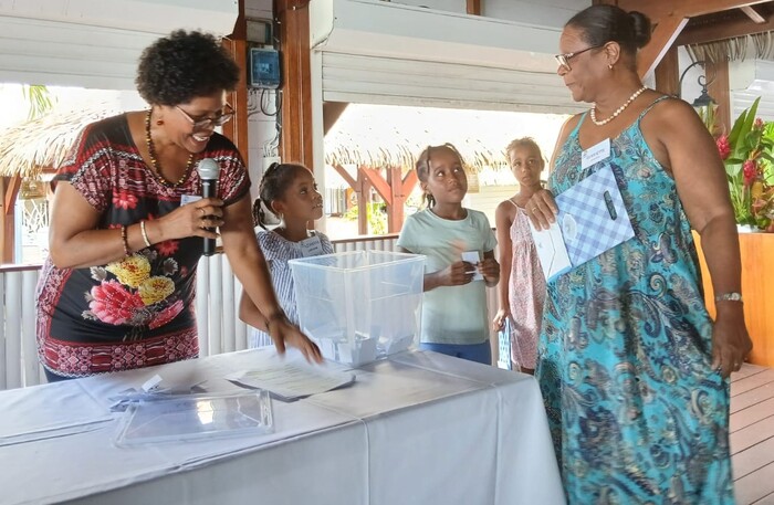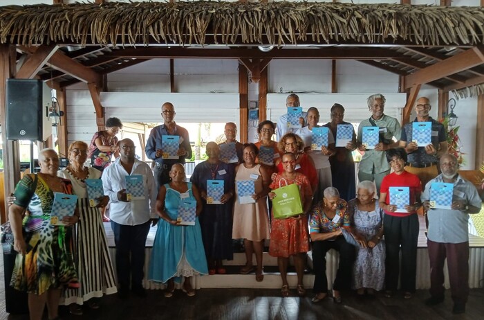 Au premier plan, à droite : Mme Yolène Largen, 1ère Adjointe au Maire de Schoelcher, suivie de Mme Sandra Sordet, de la Ville de Schoelcher, et du père Benjamin François-Haugrin. En face de ce dernier : Mr Eric Duféal, de la Ville de Schoelcher.