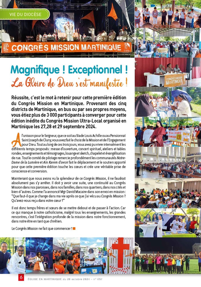 A l’unisson pour le Seigneur, que ce soit au Stade Louis Achille ou au Pensionnat Saint Joseph de Cluny, vous avez fait le choix de la Mission et de l’Engagement pour Dieu. Tout au long de ces trois jours, vous avez pu vivre intensément les différents temps proposés : messe d’ouverture, concert spirituel, ateliers et tables rondes, enseignements et témoignages, louange et sketch, chapelet et évangélisation de rue. Tout le comité de pilotage remercie profondément les communautés Notre- Dame de la Lumière et Aïn Karem d’avoir fait le déplacement et le soutien apporté pour que cette première édition touche les coeurs et crée une véritable prise de conscience et conversion. Maintenant que nous avons vu la splendeur de ce Congrès Mission, il ne faudrait absolument pas s’y arrêter. Il doit y avoir une suite, une continuité au Congrès Mission dans nos paroisses, dans nos familles, dans nos quartiers, dans nos cités et bien d ‘autres. Comme l’a annoncé Mgr David Macaire dans son envoi en mission : “Que faut-il que je change dans ma vie après ce que j’ai vécu au Congrès Mission ? Qu’avez-vous reçu dans votre coeur ?” Il est donc temps frères et soeurs de se mettre debout et de passer à l’action. Car ce qui manque à notre catholicisme, malgré tous les enseignements, les grandes rencontres, c’est l’intégration profonde de la mission dans notre fonctionnement, dans notre être en tant que chrétien.