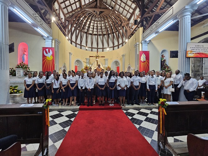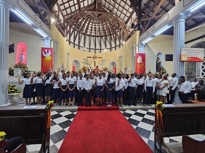 Ce samedi 07 juin, lors de la messe anticipée de Pentecôte, 67 jeunes des paroisses de Notre-Dame de L'Assomption et Saint-Paul du Morne-des-Esses ont effectué la première partie de la célébration du Sacrement de Confirmation (Appel, Profession de foi et Geste baptismal) entouré de leurs parrains et marraines.