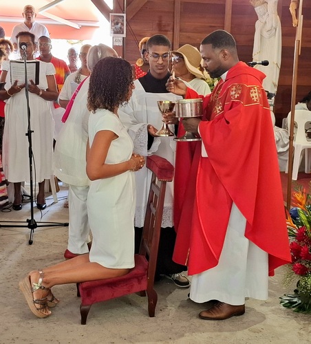 En ce dimanche de Pentecôte, l'équipe des animateurs et la communauté ont eu la joie d'accompagner une recommençante lors de sa 1ère communion et de sa confirmation. Cette personne qui avait déjà fait 2 ans de préparation, a poursuivi son cheminement avec notre équipe depuis l'an dernier. Sa persévérance et sa confiance en Dieu ont porté ses fruits en cette journée significative.